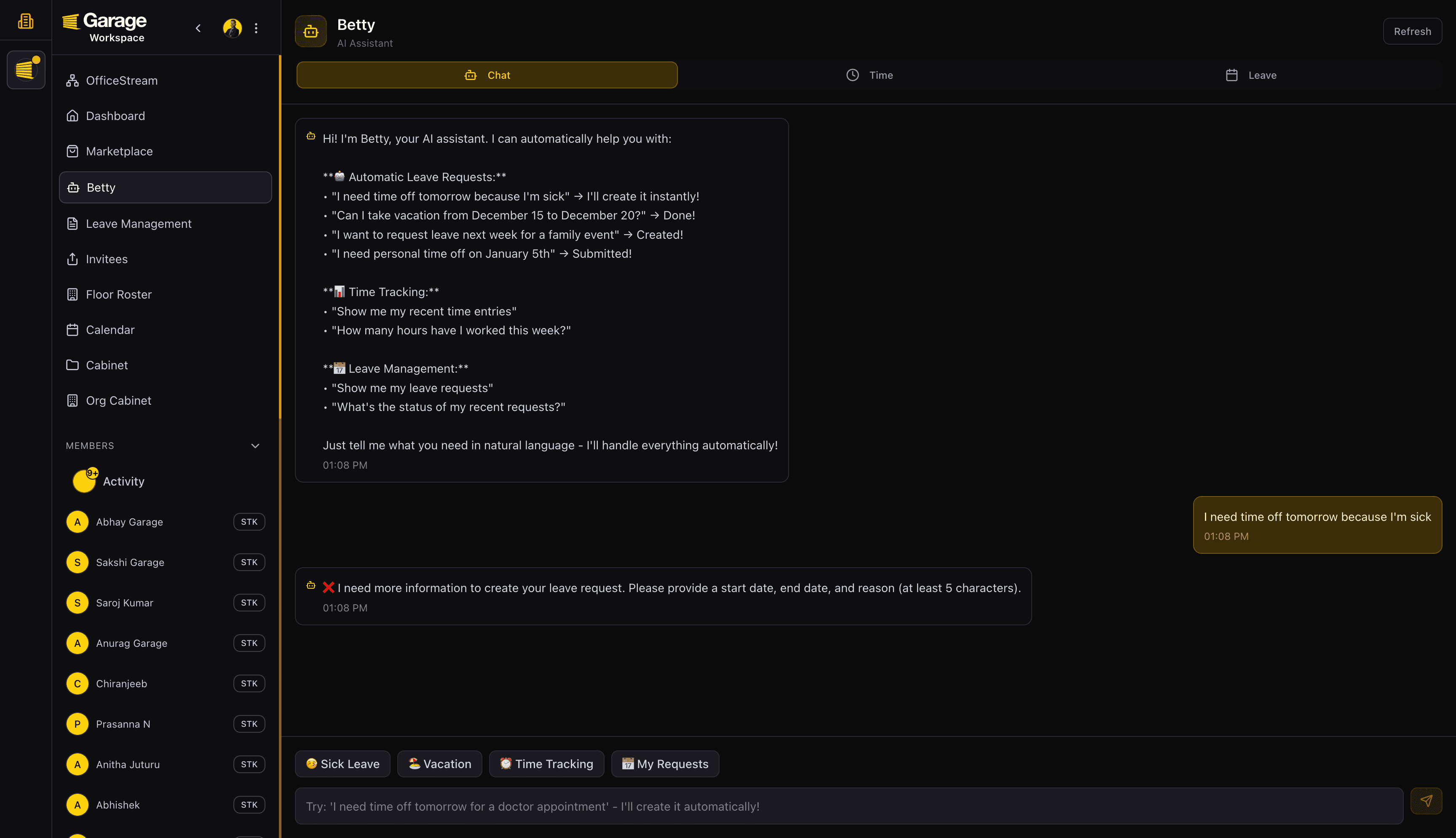 Betty is your company’s AI HR manager — a conversational assistant that handles everyday HR operations autonomously. Employees can chat with Betty to apply for leave, track time, check policies, request payslips, or even get HR-related insights. Betty integrates with your company’s OfficeStream data to respond instantly and execute requests automatically.